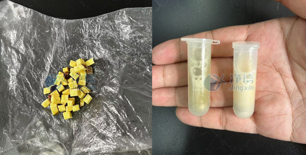 我們可以看到,番薯已經研磨完全,可以進行后續離心純化。儀器自帶冷凍,可以很好的保持RNA活性。采用一次性,無菌無酶的的研磨管和研磨珠,冷凍研磨儀可以很好的避免樣品污染,一批可以處理的樣品多樣,可以高效快速的進行批量RNA提取。