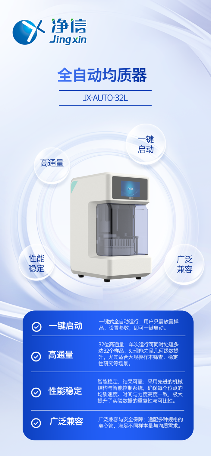 凈信JXAUTO-32L全自動(dòng)均質(zhì)器,不僅僅是一臺(tái)提升效率的設(shè)備,更是實(shí)驗(yàn)室邁向標(biāo)準(zhǔn)化、自動(dòng)化、智能化的重要一步。它通過(guò)取代重復(fù)性人工勞動(dòng)、保證數(shù)據(jù)源頭的一致性、大幅提升科研產(chǎn)出速度,為研究人員贏得了寶貴的創(chuàng)新時(shí)間。在追求效率的時(shí)代,JXAUTO-32L正成為眾多質(zhì)量控制、研發(fā)創(chuàng)新實(shí)驗(yàn)室中不可或缺的得力助手。