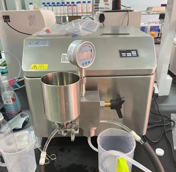04.待進料口的純水快完全進入時,即可將樣品菌絲體倒入料斗內(nèi),將壓力緩慢調(diào)到120Mpa,對樣品進行循環(huán)均質(zhì)破碎