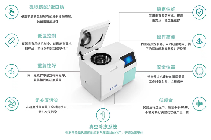 1、提取核酸/蛋白質(zhì) :低溫研磨樣品能夠有效抑制核酸降解、保留蛋白質(zhì)活性;